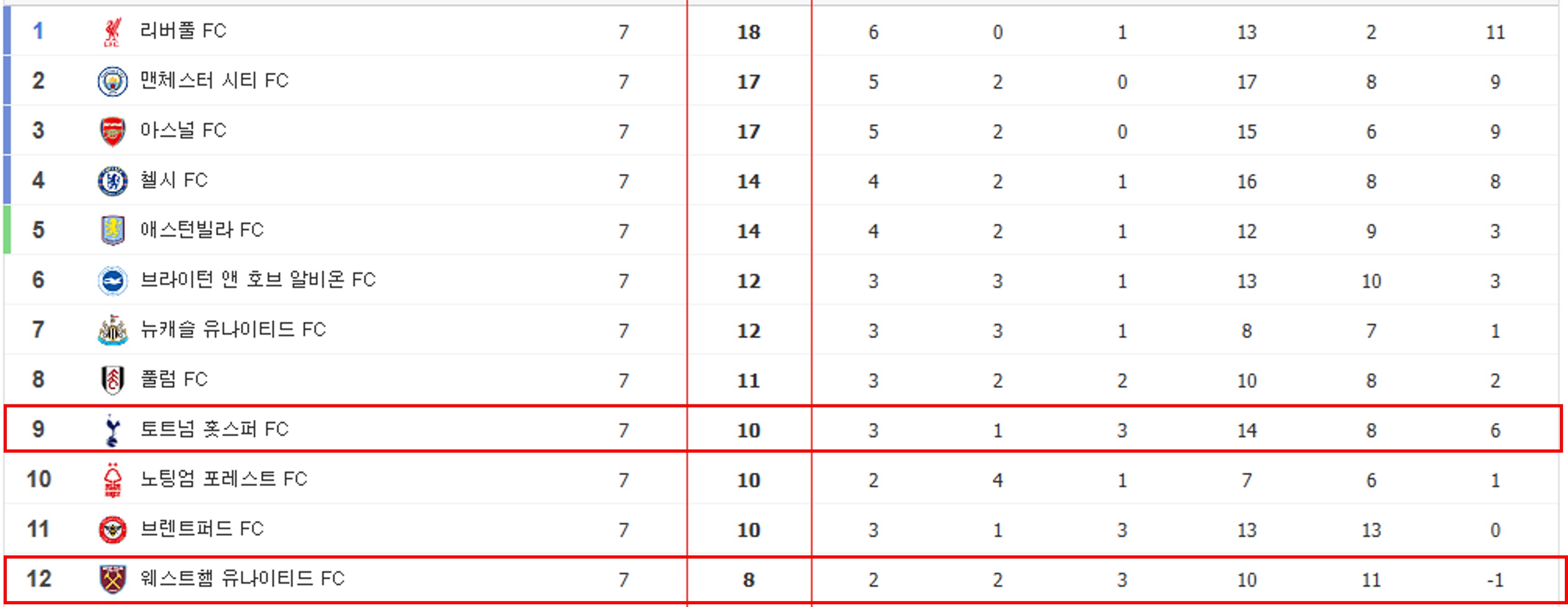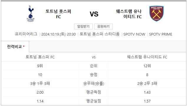 * 리그순위 : 토트넘 홋스퍼 9위 vs 웨스트햄 유나이티드 FC 12