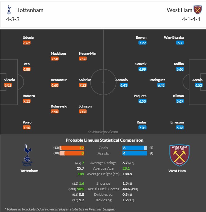 스퍼스웹과 축구통계매체 후스코어드닷컴에서는 토트넘의 공격진을 도미닉 솔란케, 브레넌 존슨, 손흥민으로 예상했습니다. 이에 맞서는 웨스트햄은 쿠두스, 파케타, 그리고 핵심선수인 보웬을 내세워 원정길에 나섭니다. 현지에서는 토트넘의 낙승을 예상하는 분위기인 만큼 토트넘이 돌아온 손흥민과 골결정력을 회복해 승리할 수 있을지 기대됩니다.